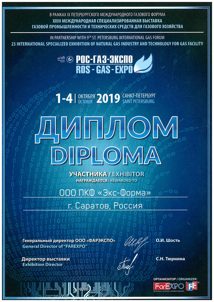 1-4 октября 2019 года компания «Экс-Форма» приняла участие в XXIII Международной специализированной выставке газовой промышленности и технических средств для газового хозяйства «РОС-ГАЗ-ЭКСПО-2019» в рамках IX Петербургского международного газового Форума.