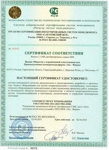 2 апреля 2015 года предприятием ПКФ ЭКС-ФОРМА был получен сертификат соответствия требованиям системе менеджмента качества ГОСТ ISO 9001-2011 (ISO 9001:2008) применительно к проектированию, разработке и производству газового оборудования для систем газораспределения и газоснабжения, теплоэнергетического оборудования и комплектующих к ним, приведению проектных работ, влияющих на безопасность объектов капительного строительства в области газораспределительных систем, тепловодоснабжения и вентиляции, автоматизации и управления инженерными системами.