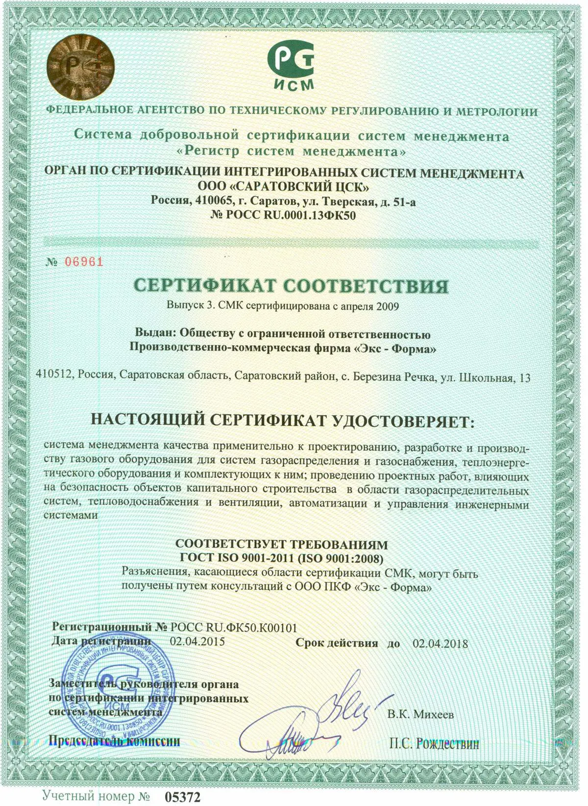 2 апреля 2015 года предприятием ПКФ ЭКС-ФОРМА был получен сертификат соответствия требованиям системе менеджмента качества ГОСТ ISO 9001-2011 (ISO 9001:2008) применительно к проектированию, разработке и производству газового оборудования для систем газораспределения и газоснабжения, теплоэнергетического оборудования и комплектующих к ним, приведению проектных работ, влияющих на безопасность объектов капительного строительства в области газораспределительных систем, тепловодоснабжения и вентиляции, автоматизации и управления инженерными системами.